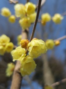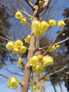 2月の花として代表的な蝋梅が見ごろとなっています。 境内の東の方に植えられているため、風向きによってとてもいい香りがしてきます。寒い季節ですが、お日様の光をたくさん受けて黄色が輝いて見えます。
